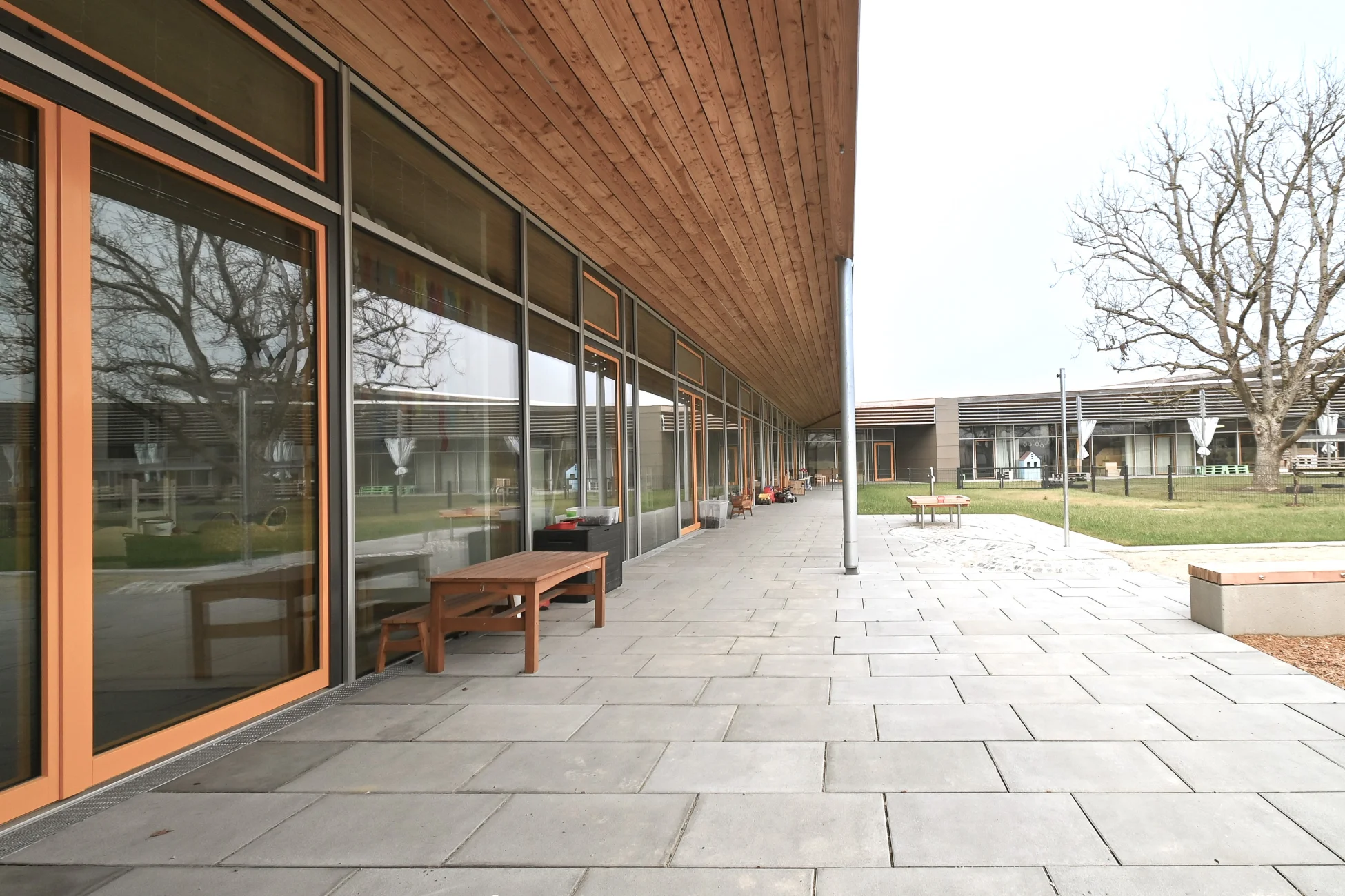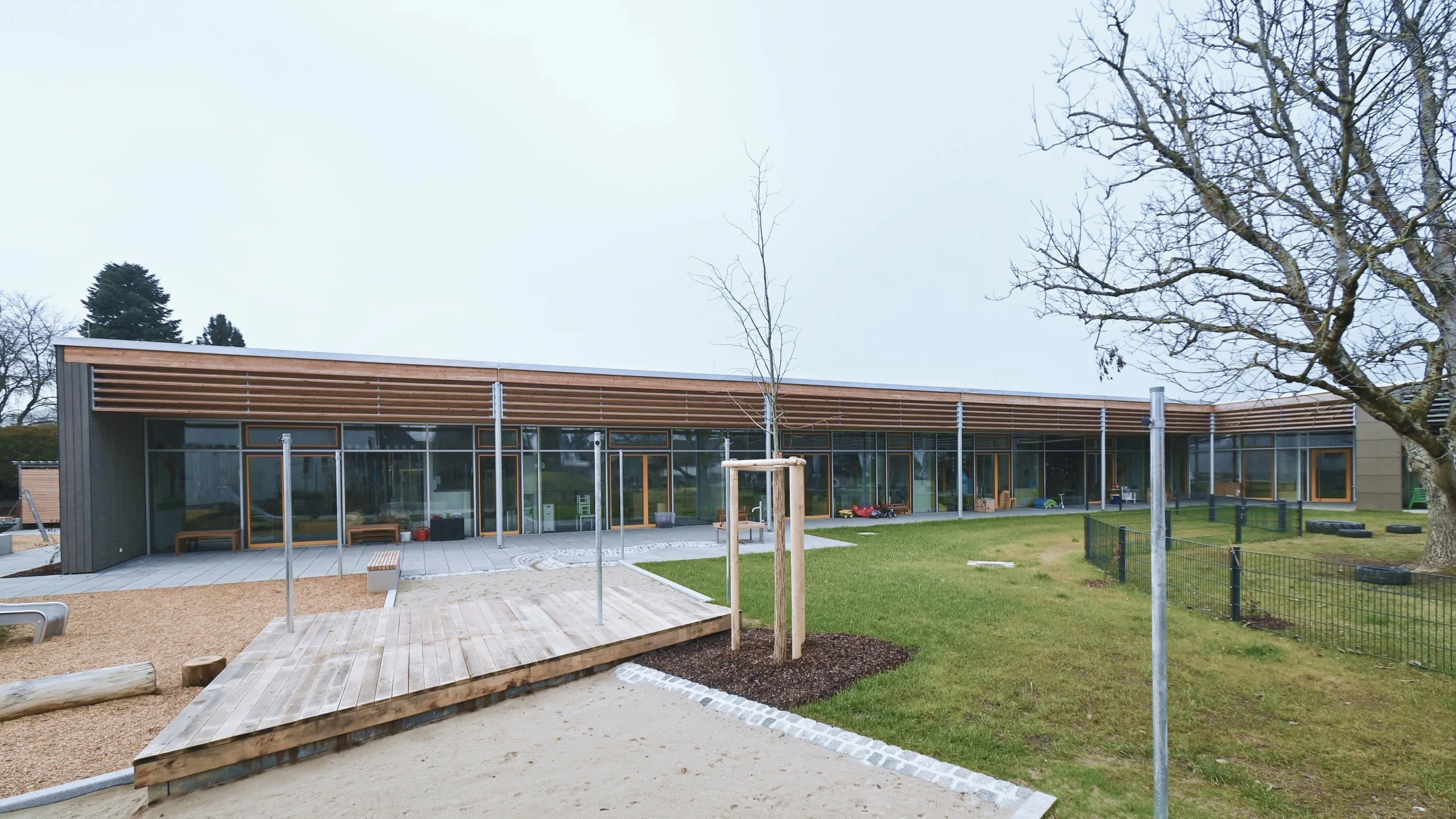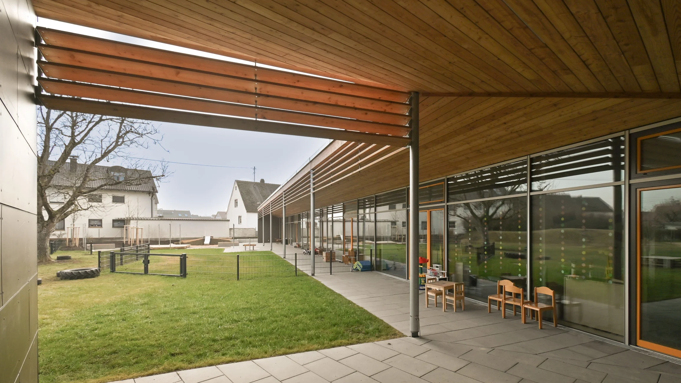 Das Gebäude vermittelt durch seine Höhenentwicklung unaufdringlich zwischen niedriger Wohnbebauung sowie Feld und Flur. Die Nutzungen beider BA's gruppieren sich erdgeschossig rund um großzügige, helle und vielseitig nutzbare Foyer- u. Spielbereiche. Mobile Trennwände erl. viels. Nutzungen im Inneren. Großflächige Verglasungen und den Gruppenräumen vorgelagerte überdeckte Terrassen stellen einen intensiven Bezug zum weitläufigen, durch die winkelförmige Anordnung der Baukörper gefassten und geschützen Garten her. In Verbindung mit dem 2011 realisierten Bestandsbau sind in der Gesamteinrichtung nun insgesamt 9 Gruppen (4x Krippe, 5x KiGa) untergebracht. Die Dachfläche des Erweiterungsbaus ist extensiv begrünt und für die Montage einer PV-Anlage vorbereitet.