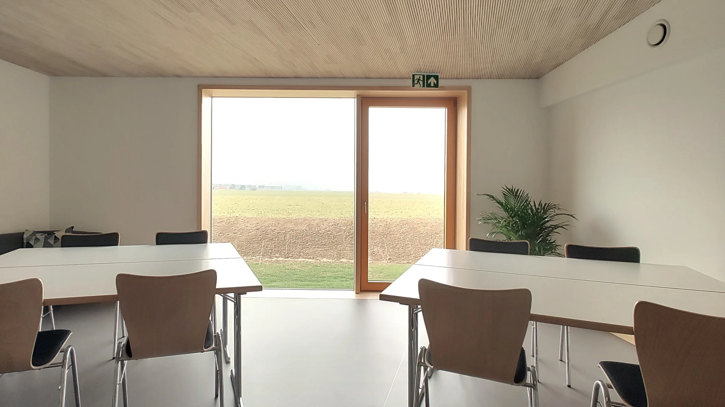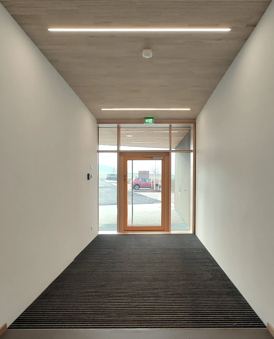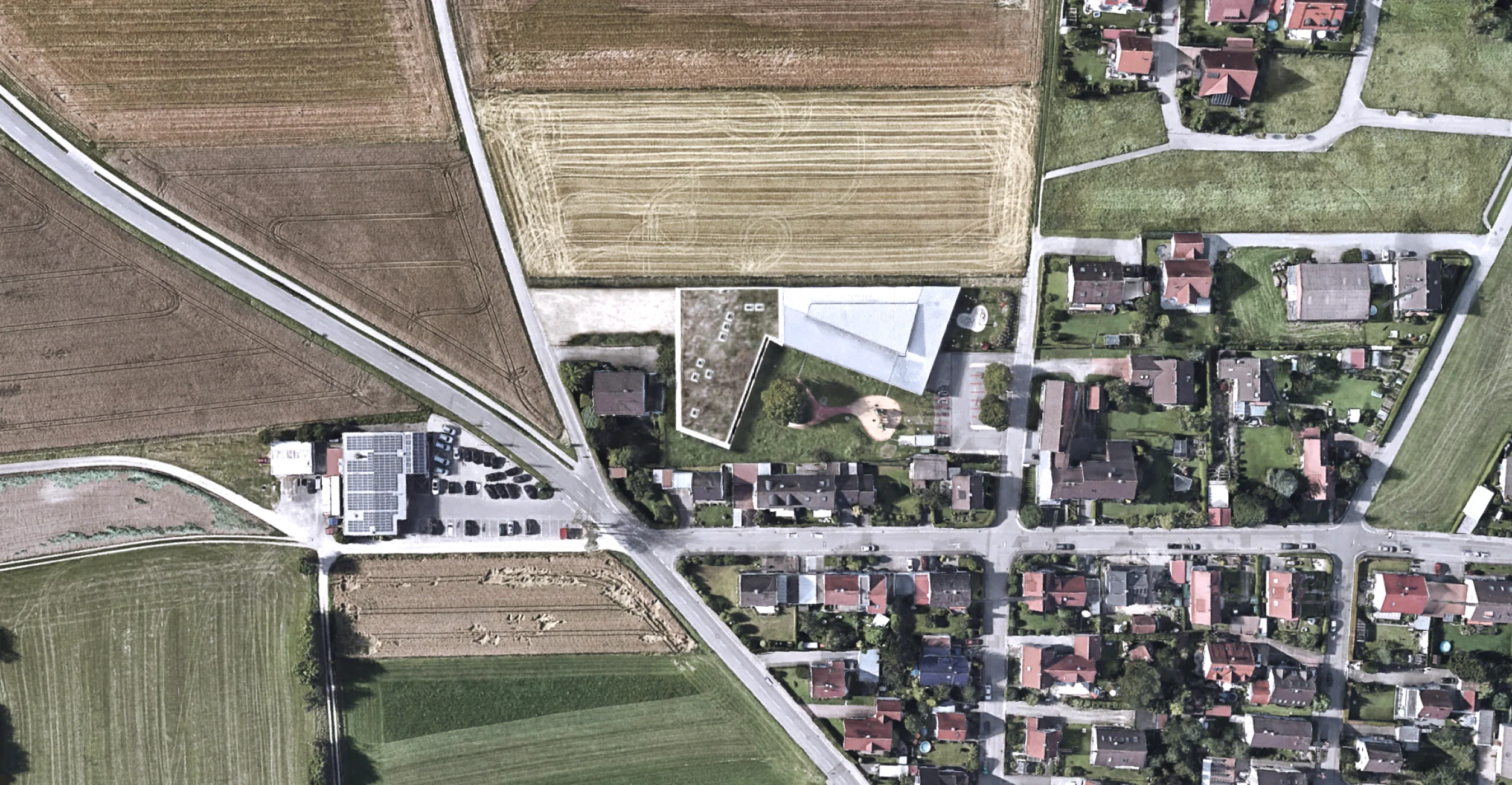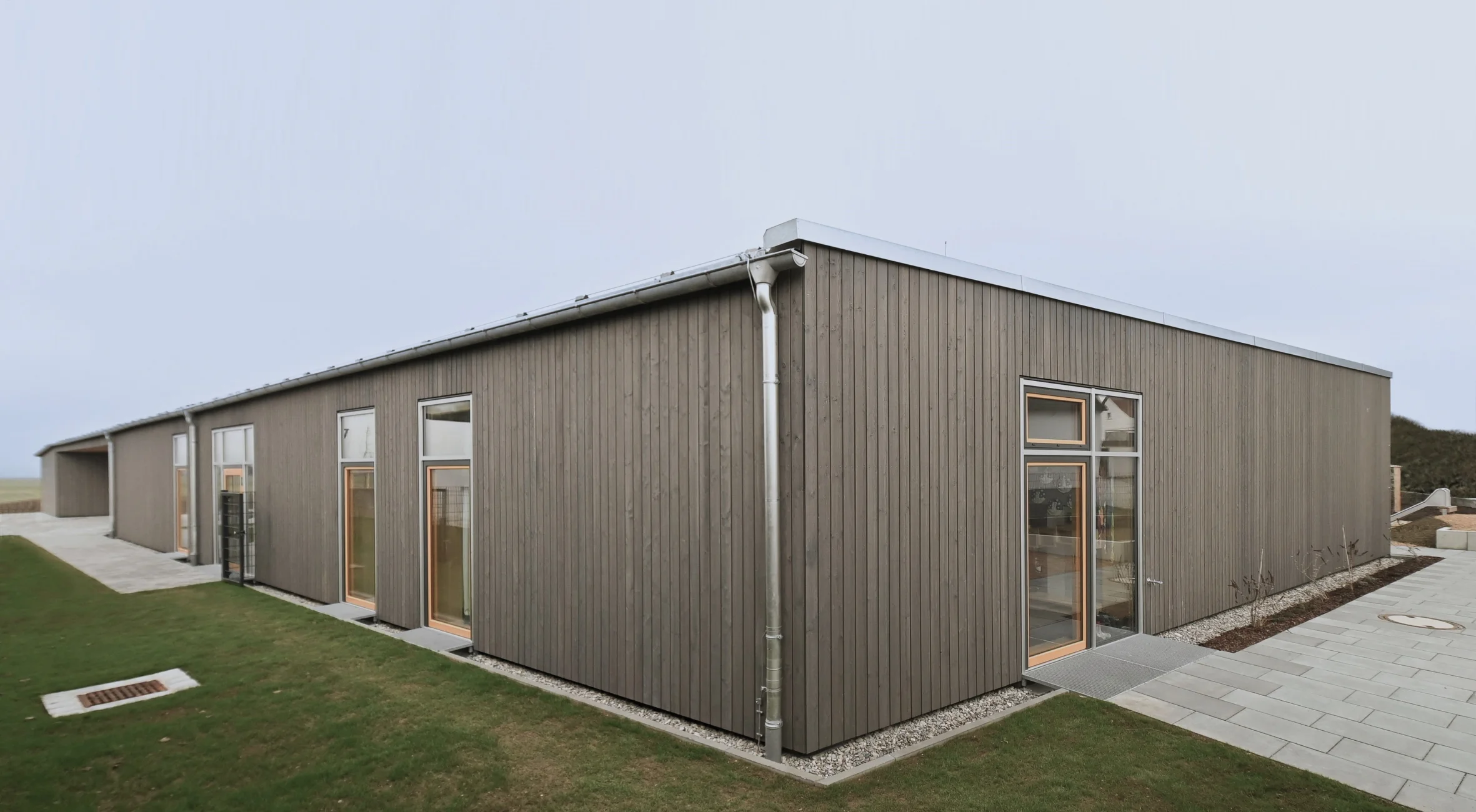 Das Gebäude vermittelt durch seine Höhenentwicklung unaufdringlich zwischen niedriger Wohnbebauung sowie Feld und Flur. Die Nutzungen beider BA's gruppieren sich erdgeschossig rund um großzügige, helle und vielseitig nutzbare Foyer- u. Spielbereiche. Mobile Trennwände erl. viels. Nutzungen im Inneren. Großflächige Verglasungen und den Gruppenräumen vorgelagerte überdeckte Terrassen stellen einen intensiven Bezug zum weitläufigen, durch die winkelförmige Anordnung der Baukörper gefassten und geschützen Garten her. In Verbindung mit dem 2011 realisierten Bestandsbau sind in der Gesamteinrichtung nun insgesamt 9 Gruppen (4x Krippe, 5x KiGa) untergebracht. Die Dachfläche des Erweiterungsbaus ist extensiv begrünt und für die Montage einer PV-Anlage vorbereitet.