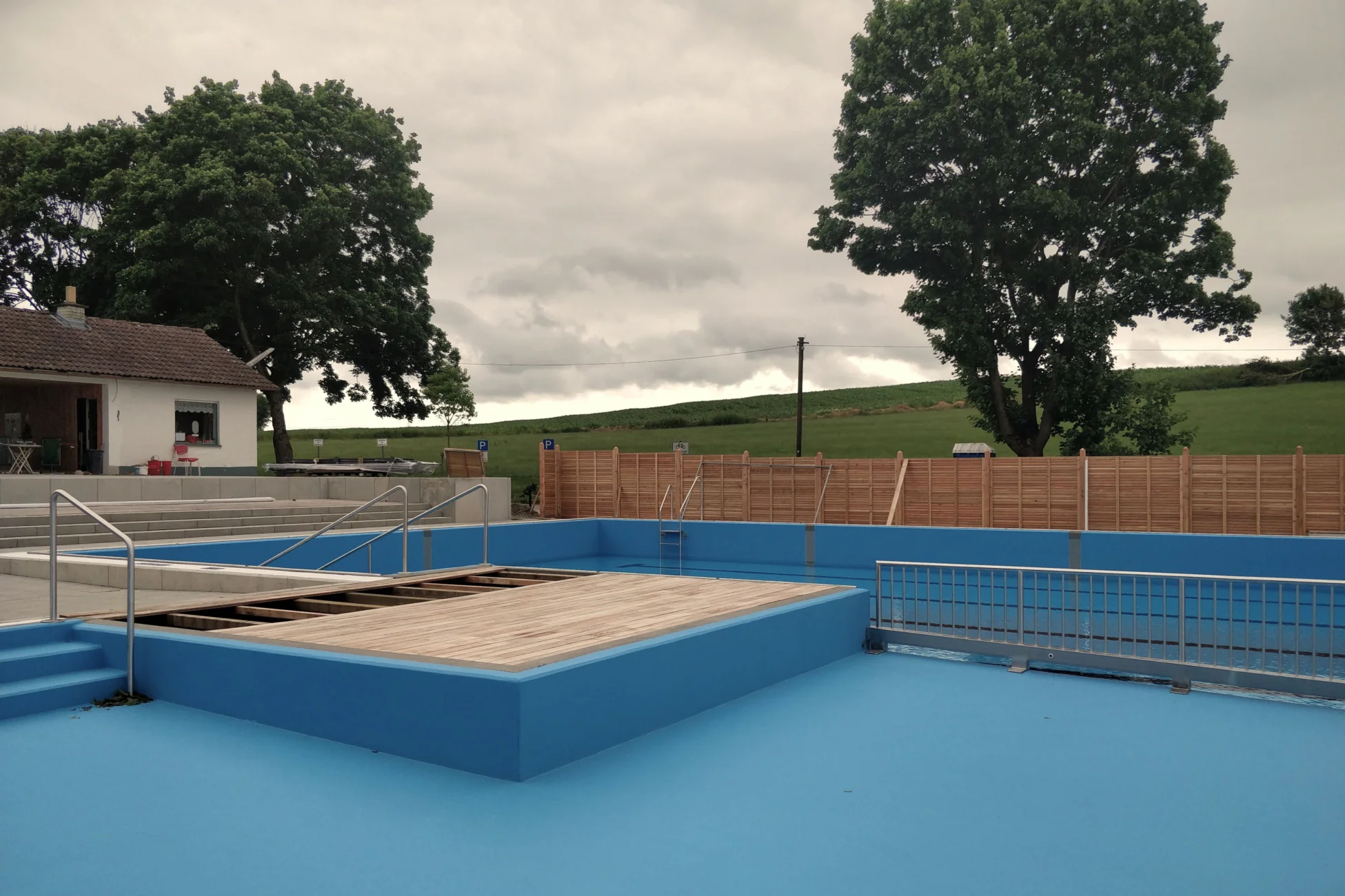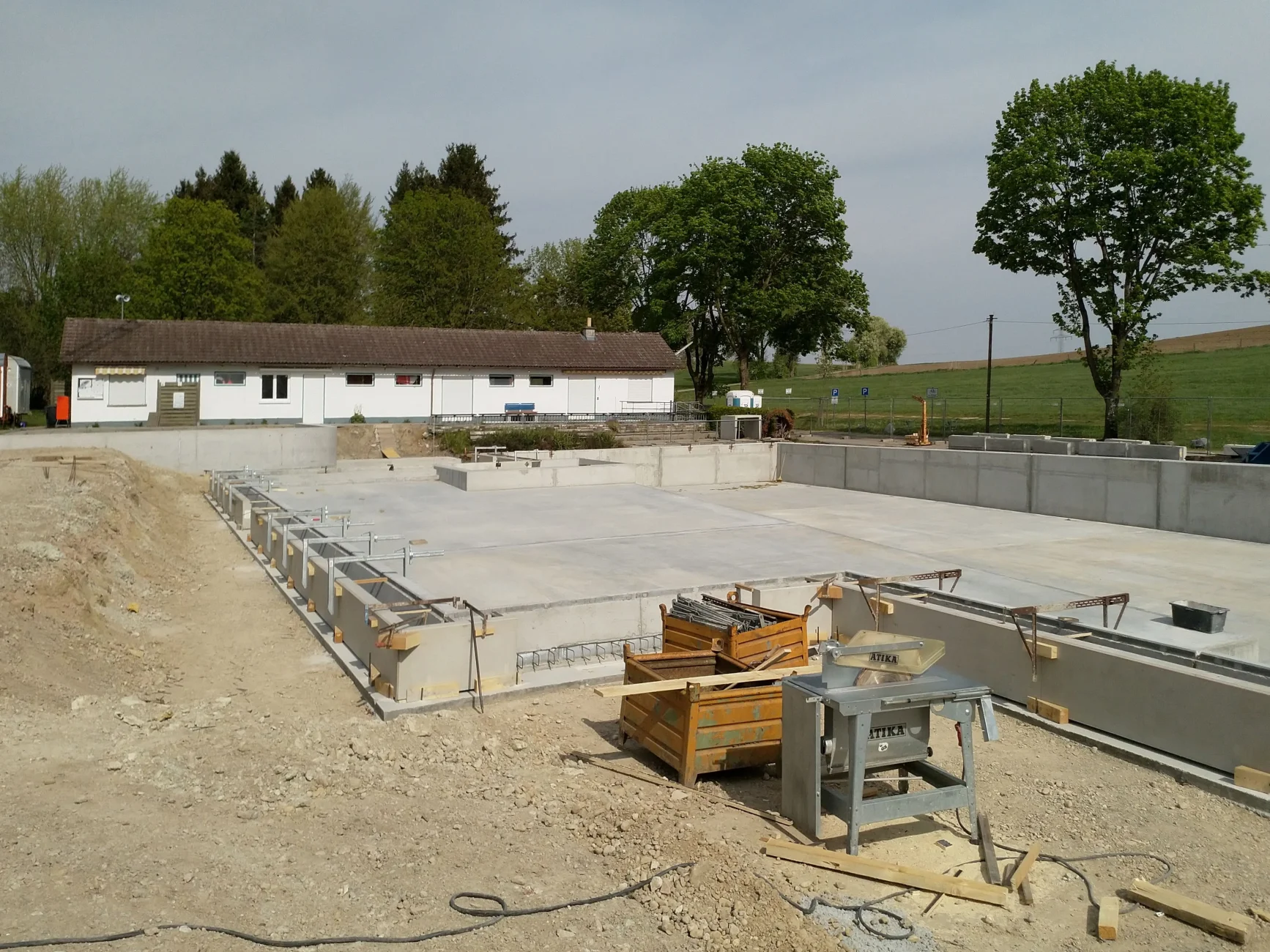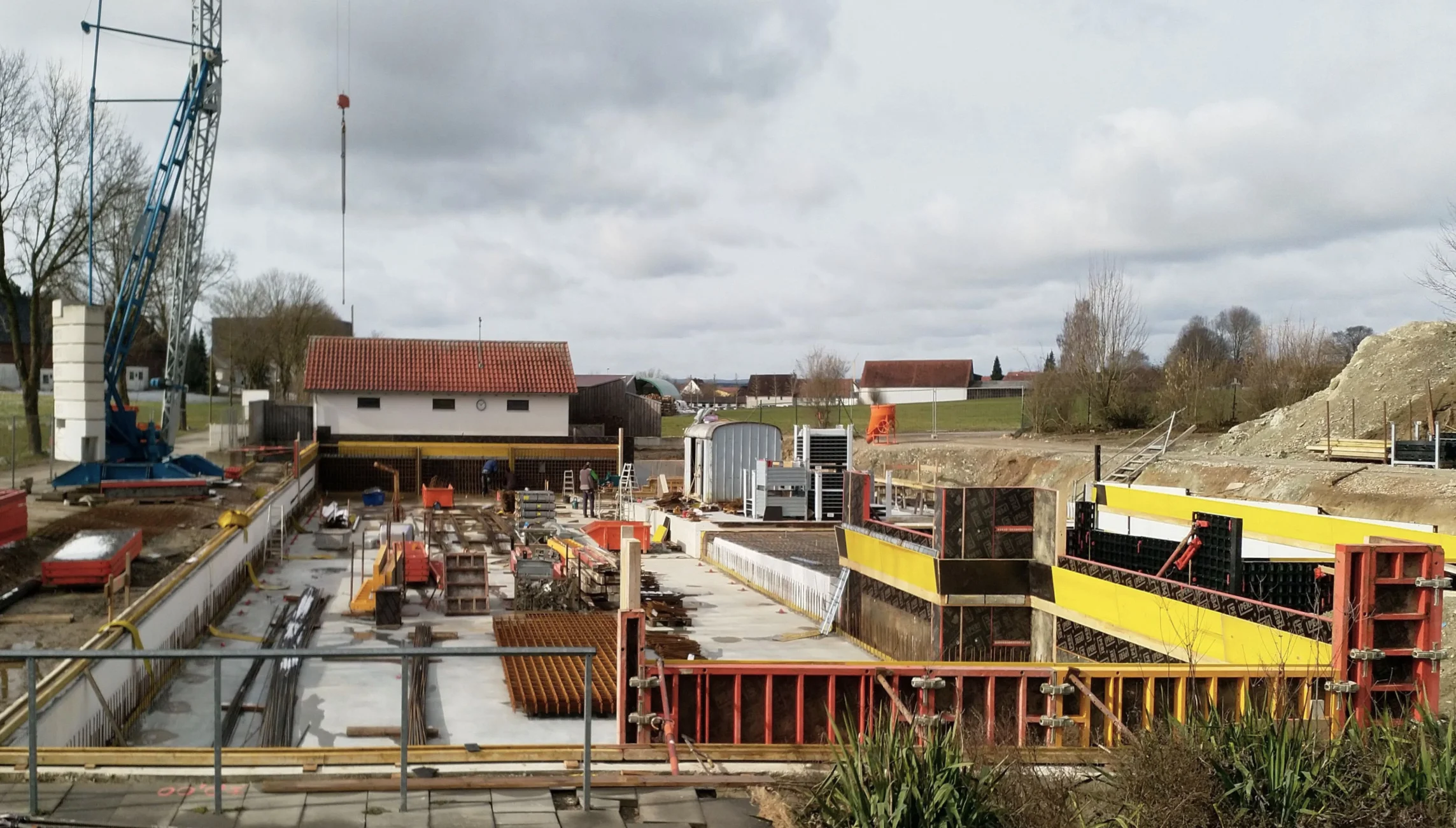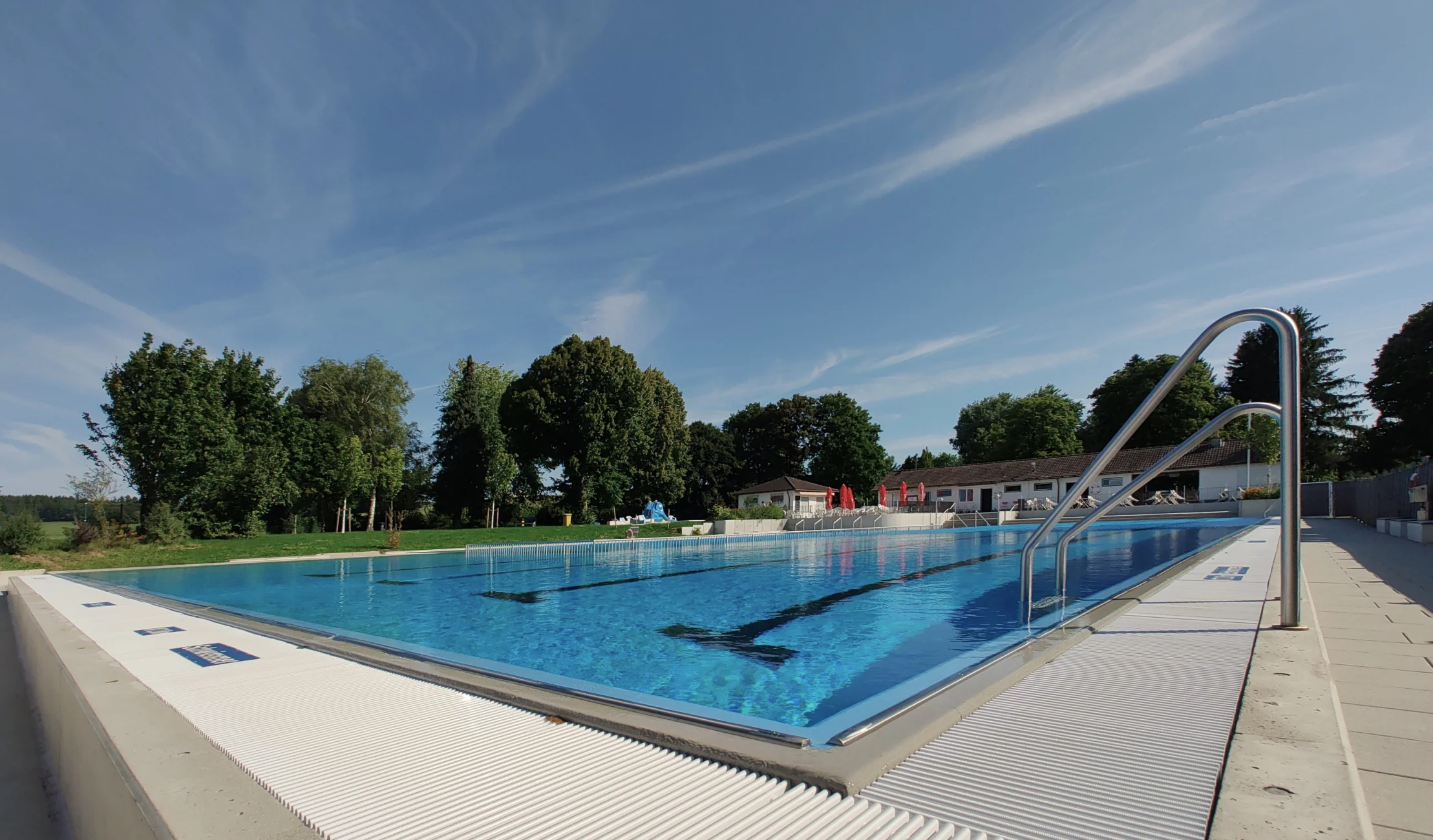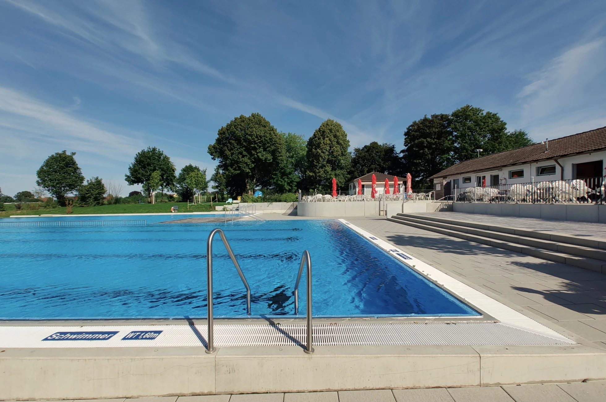 Nach mehr als 50 Jahren musste das Ende der 1960er Jahre in Eigenleistung von engagierten Bürgern gebaute Freibad in Kutzenhausen wegen erheblicher baulicher Mängel instandgesetzt werden. Langer Vorlaufzeit und viele Abwägungen waren erforderlich bis letztlich die Entscheidung getroffen wurde, ein neues Stb.-Becken in das vorhandene Bauwerk einzubetten. Um die Setzungen auf dem nur sehr eingeschränkt tragfähigen Baugrund in den erforderlichen Grenzen zu halten mussten zunächst ca. 200 Bohrpfähle durch die vorhandene Bodenplatte hindurch eingebracht werden. Diese tragen nun die neue Stahlbeton-Konstruktion, die als "weisse Wanne" ohne zusätzliche Abdichtungsmaterialien ausgeführt wurde. Die Ausbildung des Beckenkopfes als Kombination von Ortbeton- und Stb.-Fertigteilen war eine bautechnische Meisterleistung. Nahezu gefällefrei wird das überströmende Wasser über die umlaufende Rinne zurück zum Technikgebäude geführt. Dort wird es gereinigt und über Vierkantrohre aus Edelstahl (gleichzeitig die erforderliche "Stehstufe") versehen mit Einströmdüsen dem Beckenwasser wohldosiert wieder zugeführt.