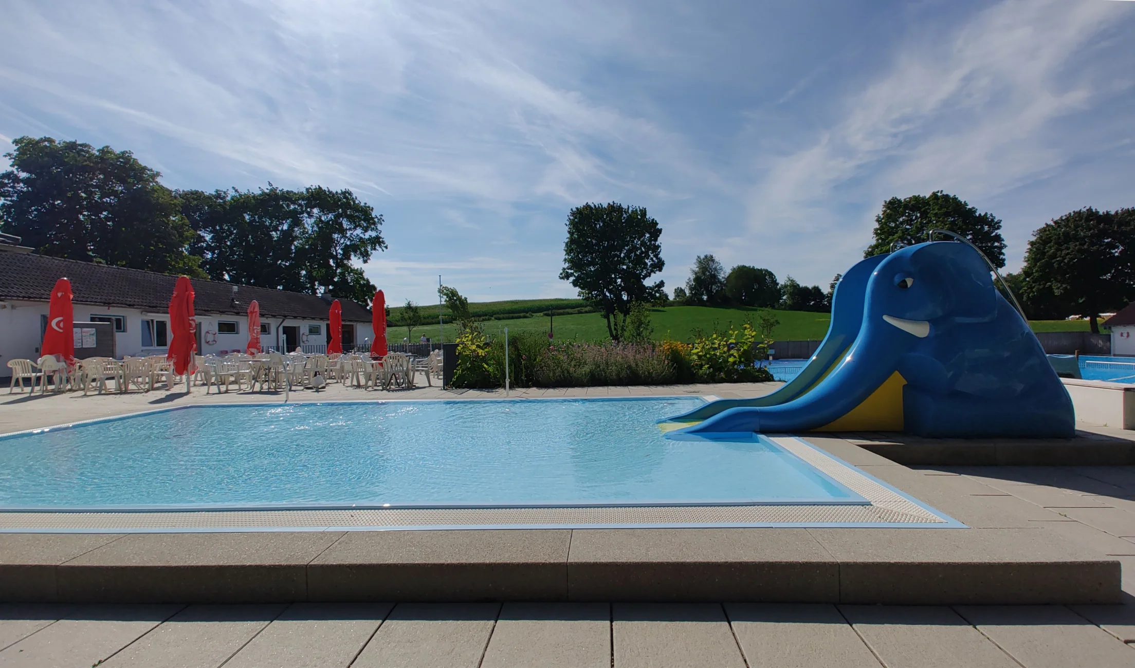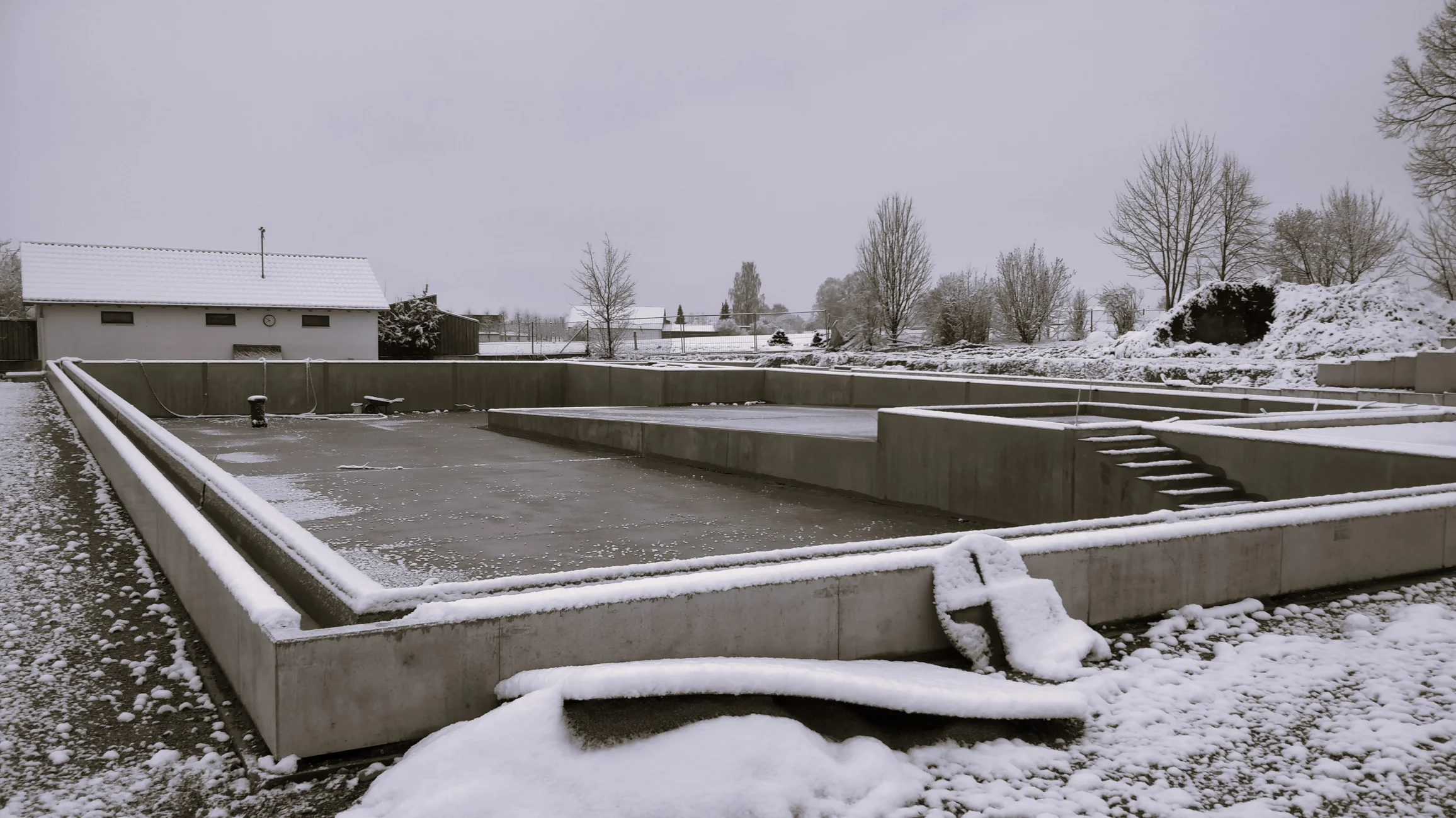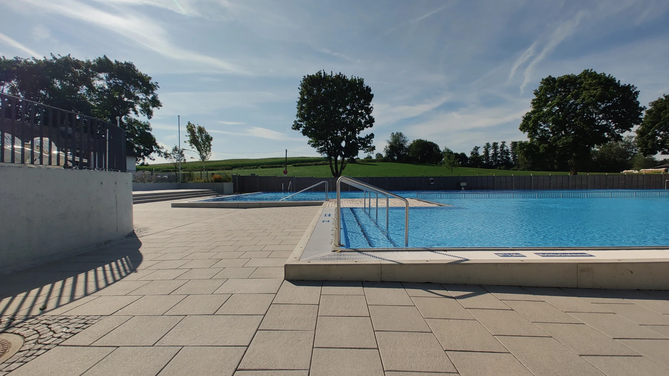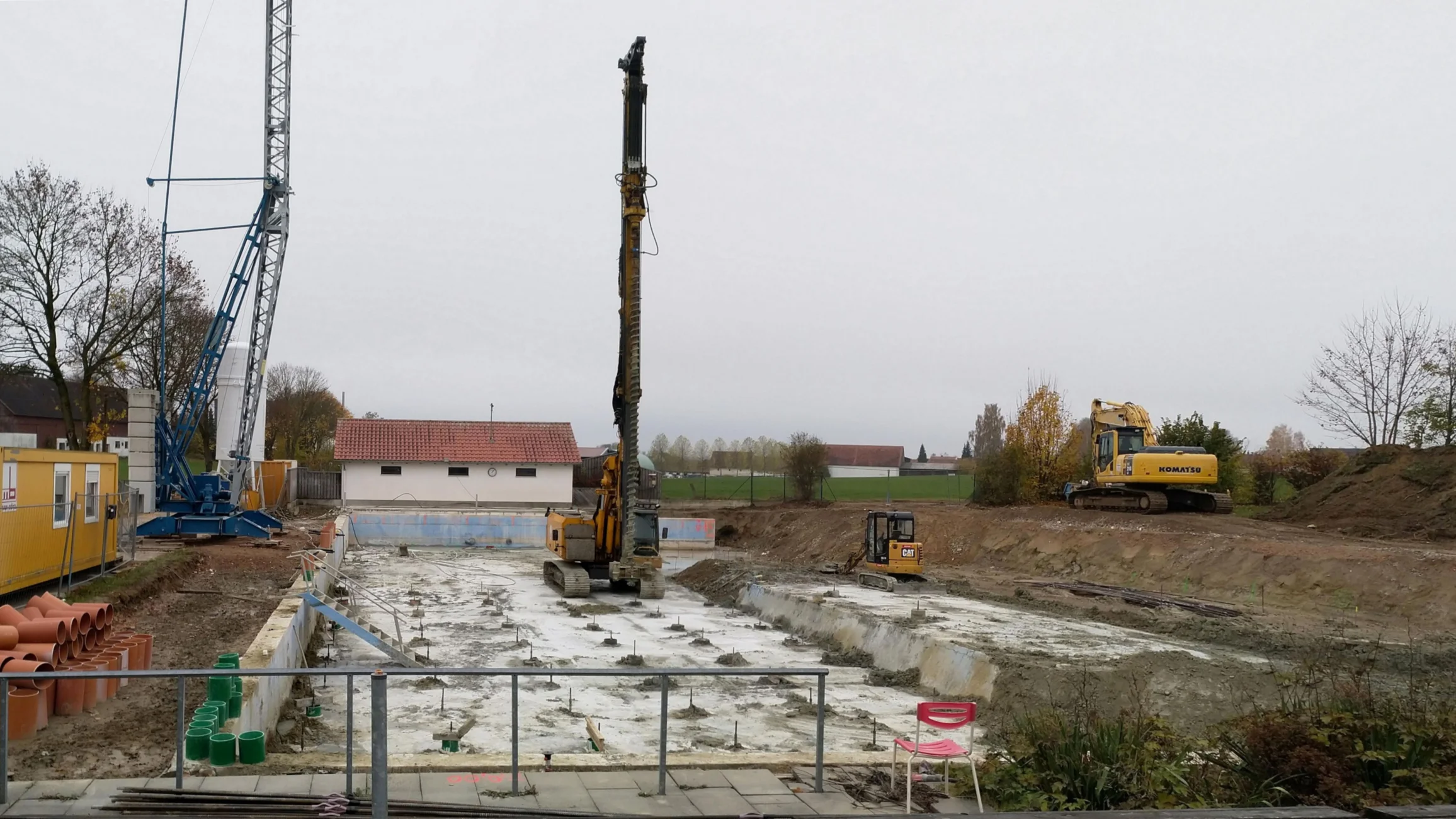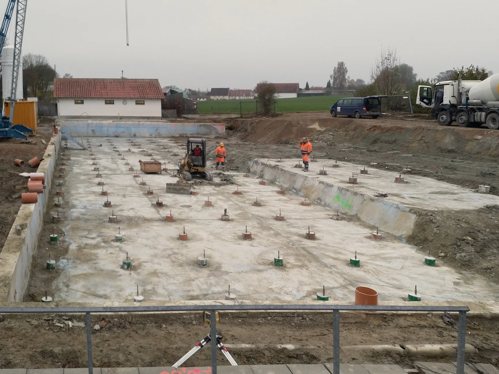 Nach mehr als 50 Jahren musste das Ende der 1960er Jahre in Eigenleistung von engagierten Bürgern gebaute Freibad in Kutzenhausen wegen erheblicher baulicher Mängel instandgesetzt werden. Langer Vorlaufzeit und viele Abwägungen waren erforderlich bis letztlich die Entscheidung getroffen wurde, ein neues Stb.-Becken in das vorhandene Bauwerk einzubetten. Um die Setzungen auf dem nur sehr eingeschränkt tragfähigen Baugrund in den erforderlichen Grenzen zu halten mussten zunächst ca. 200 Bohrpfähle durch die vorhandene Bodenplatte hindurch eingebracht werden. Diese tragen nun die neue Stahlbeton-Konstruktion, die als "weisse Wanne" ohne zusätzliche Abdichtungsmaterialien ausgeführt wurde. Die Ausbildung des Beckenkopfes als Kombination von Ortbeton- und Stb.-Fertigteilen war eine bautechnische Meisterleistung. Nahezu gefällefrei wird das überströmende Wasser über die umlaufende Rinne zurück zum Technikgebäude geführt. Dort wird es gereinigt und über Vierkantrohre aus Edelstahl (gleichzeitig die erforderliche "Stehstufe") versehen mit Einströmdüsen dem Beckenwasser wohldosiert wieder zugeführt.
